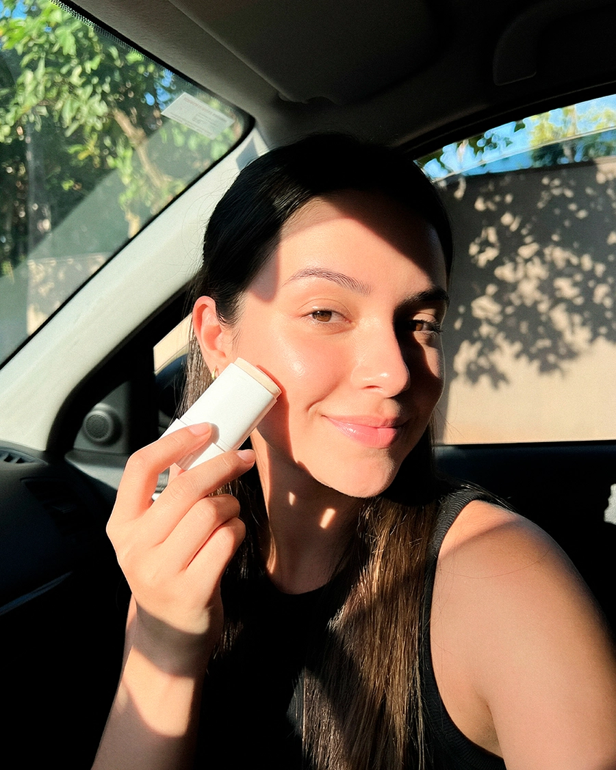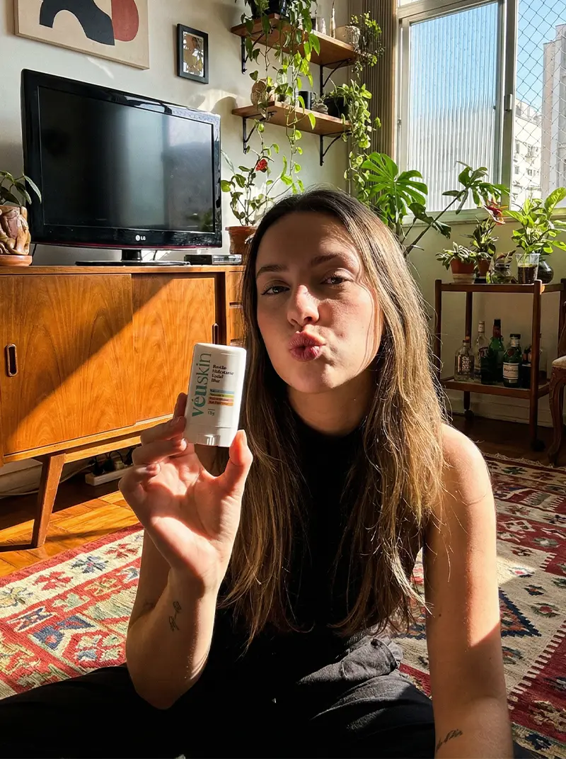 “Não consigo mais sair de casa sem ele. Fica na bolsa, na mesa, no carro… virou parte da minha rotina. Sempre tive preguiça de reaplicar hidratante durante o dia, mas com o bastão da VéuSkin ficou fácil e rápido. A textura é deliciosa, não pesa e deixa a pele com viço real.”
